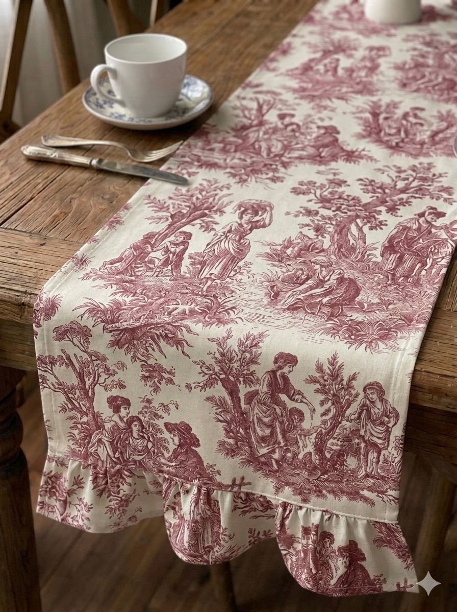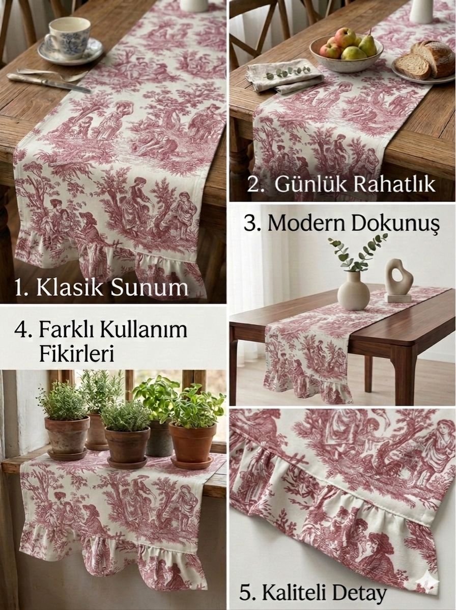 Sofralarınızda Fransız Esintisi: Zarafeti Evinize klasik bir sanat dokunuşu katmaya ne dersiniz? 18. yüzyılın ikonik Fransız deseni tasarlanan bu fırfırlı runner, sadece bir runner değil, sofralarınızın hikayesini anlatan bir dekorasyon parçasıdır.