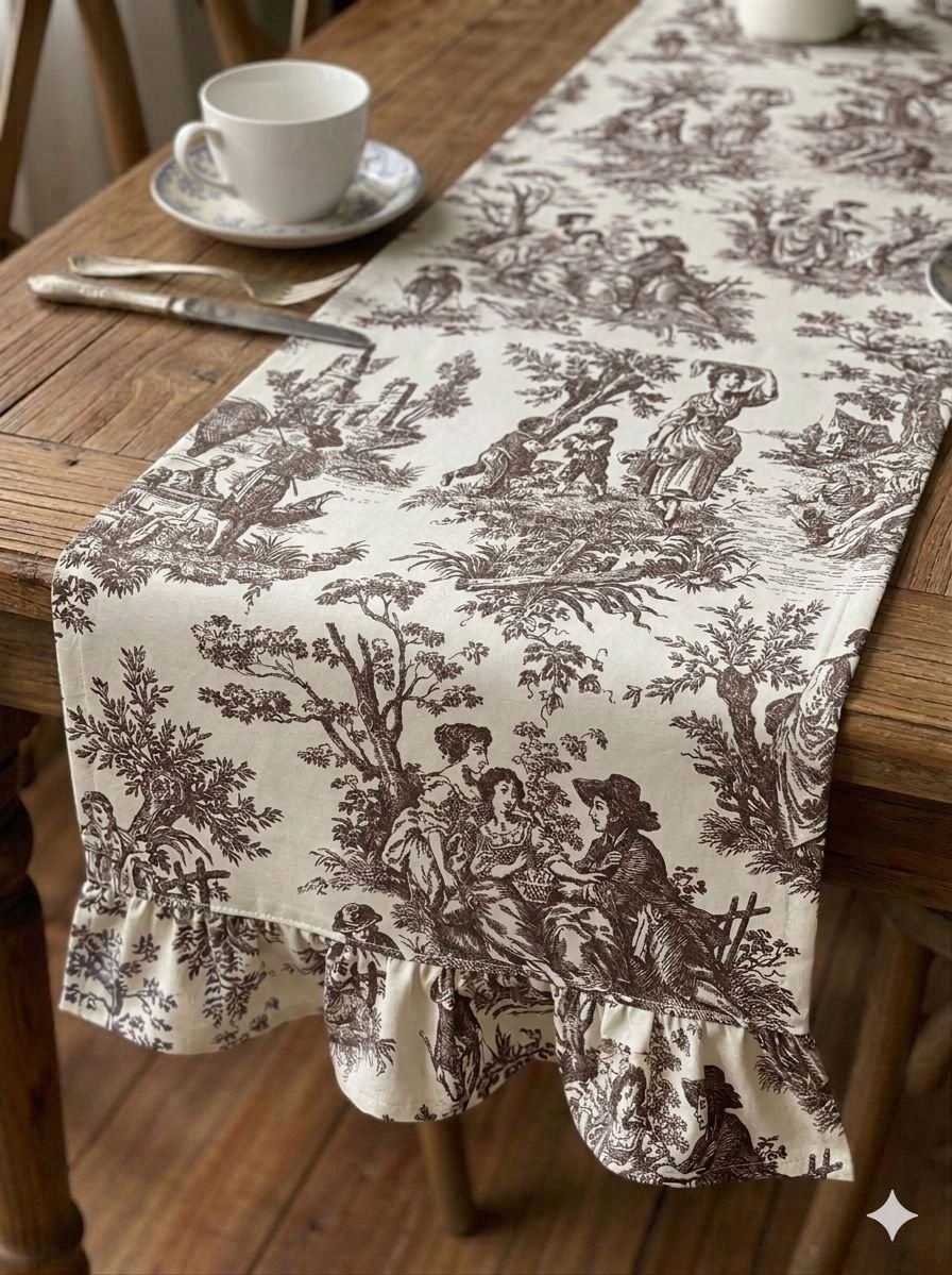 Fransız Köylü Desenli Fırfırlı Masa Runnerı Kahverengi (Ranır) Leke Tutmaz Keten Kumaş 40x140cm